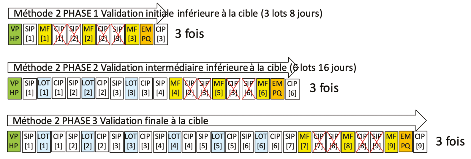 During initial validation of the duration and number of batches, APS and EMPQs are generally performed together. In theory, two methods may be envisaged: the “single stage” method or the “iterative” method.